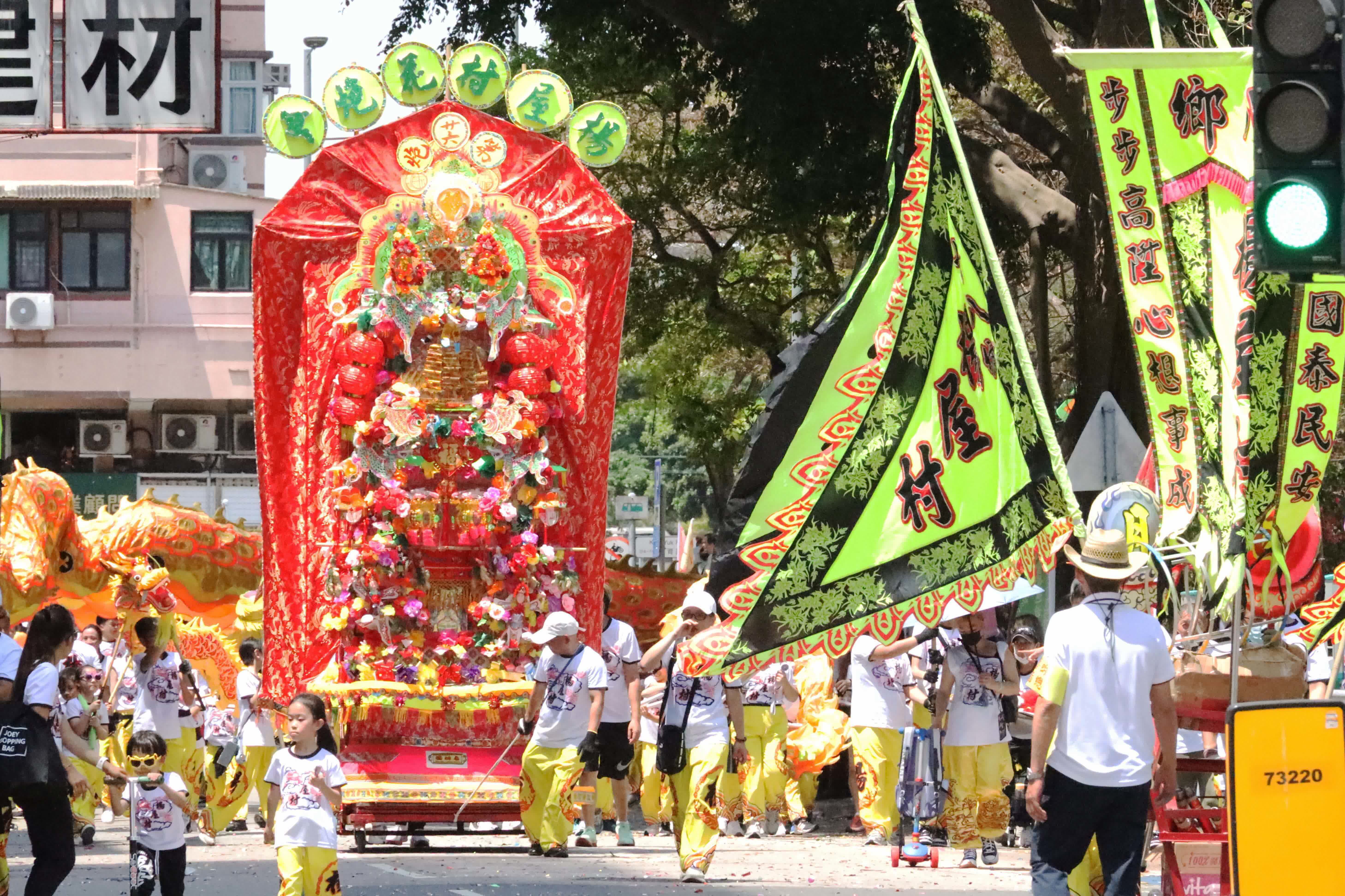 昨天(20日),是農曆三月廿三日天后誕,香港多區舉辦傳統慶祝活動。具有圍村文化特色的元朗十八鄉天后寶誕會景巡遊在元朗市中心舉行,巡遊合共37支花炮隊及表演隊伍,舞龍舞獅、英歌舞齊上陣,吸引大批市民到場觀看,與巡遊隊伍和今年新加入的熊貓吉祥物合影留念。