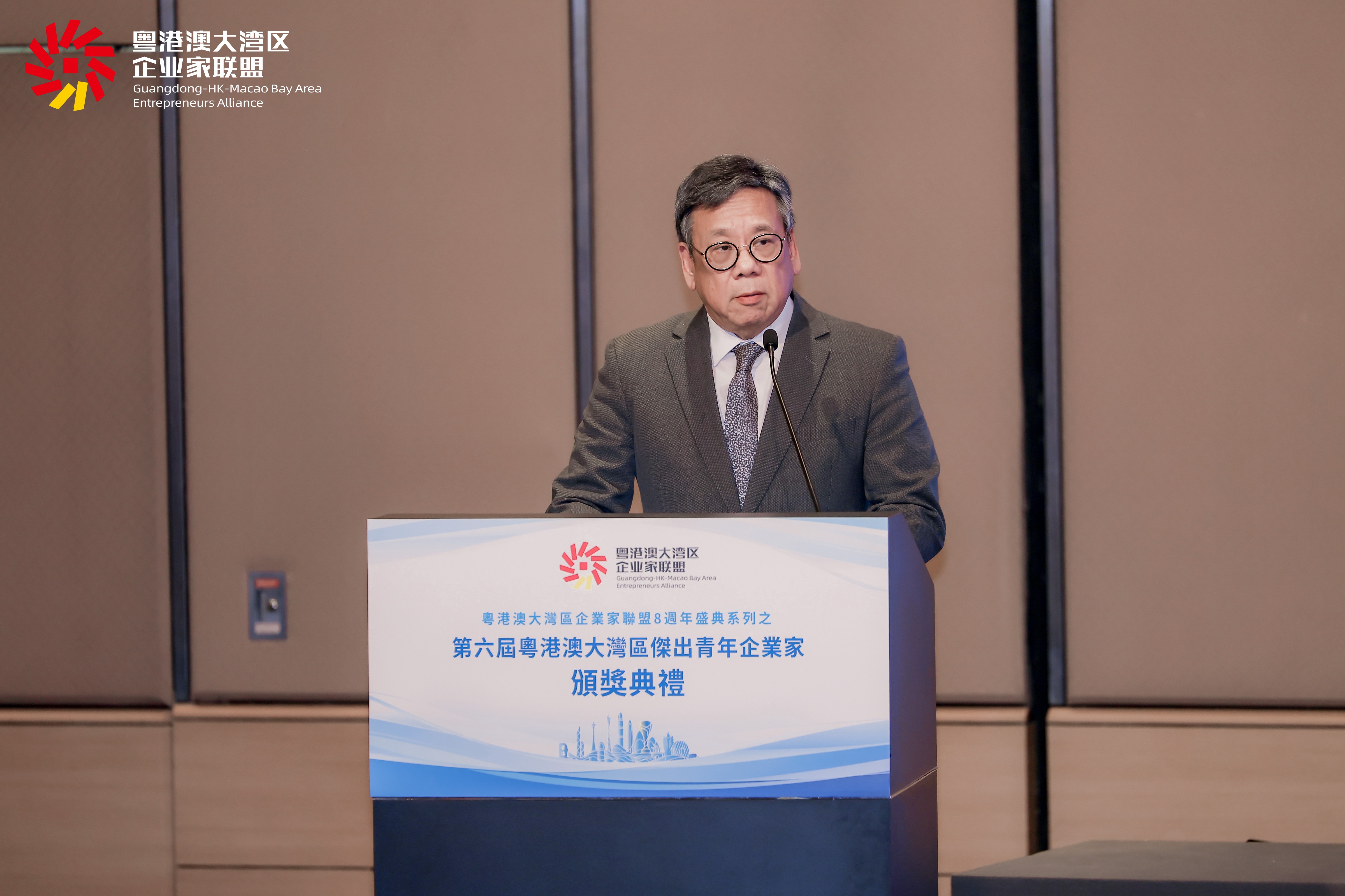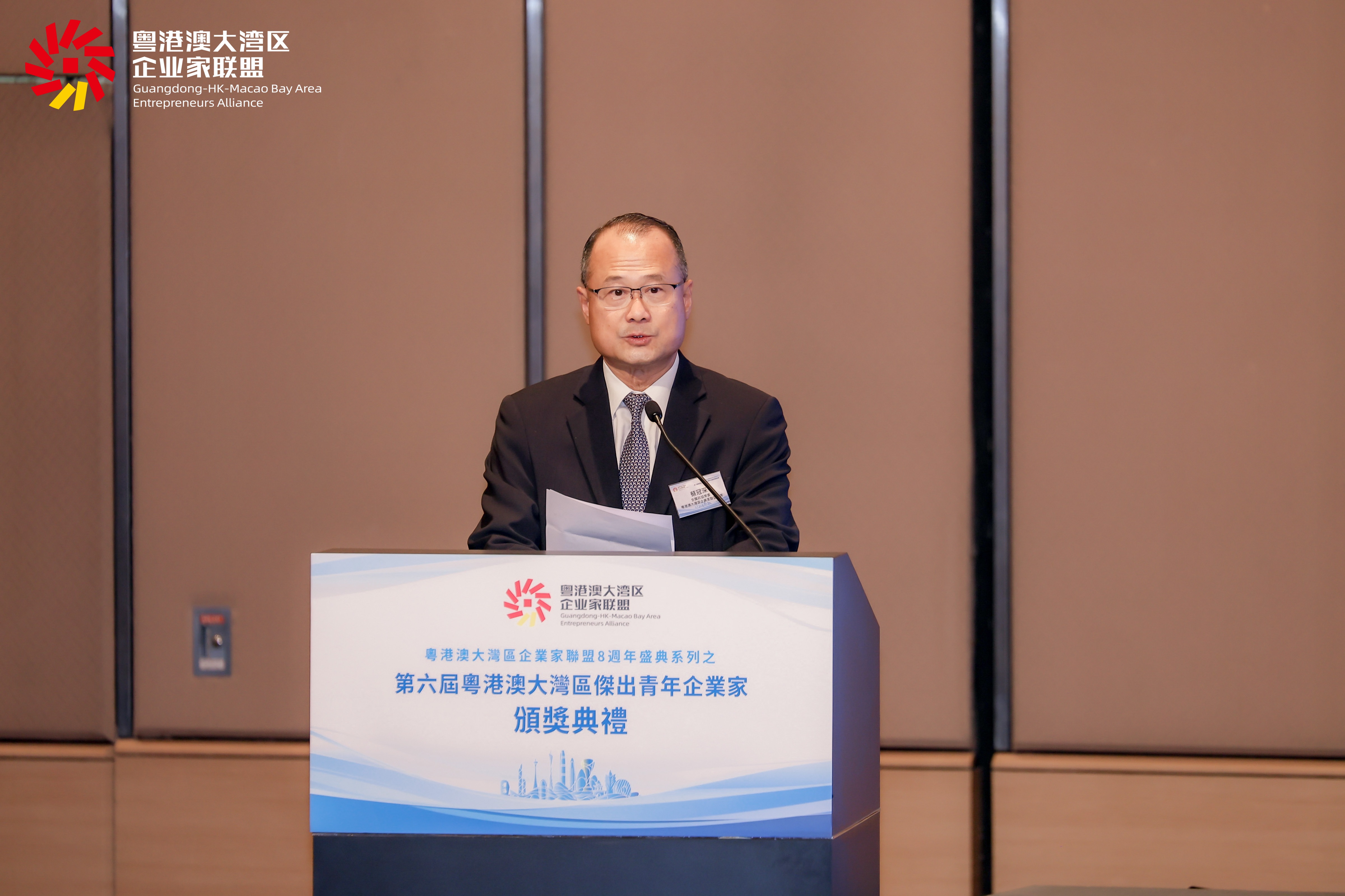 商務及經濟發展局局長丘應樺在致辭中祝賀所有獲獎青年企業家,讚揚他們是推動粵港澳大灣區發展的核心力量。他指出,大灣區人口超過