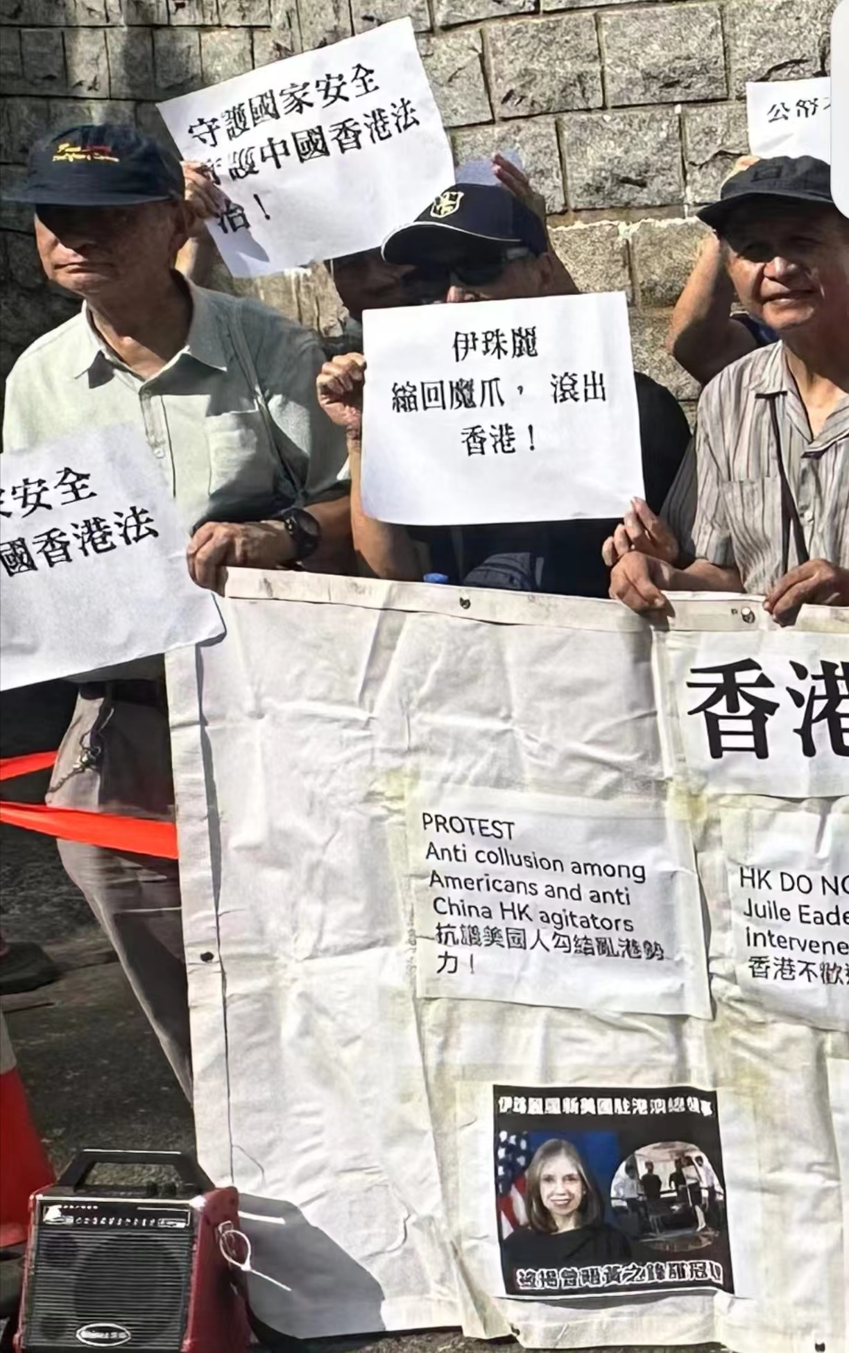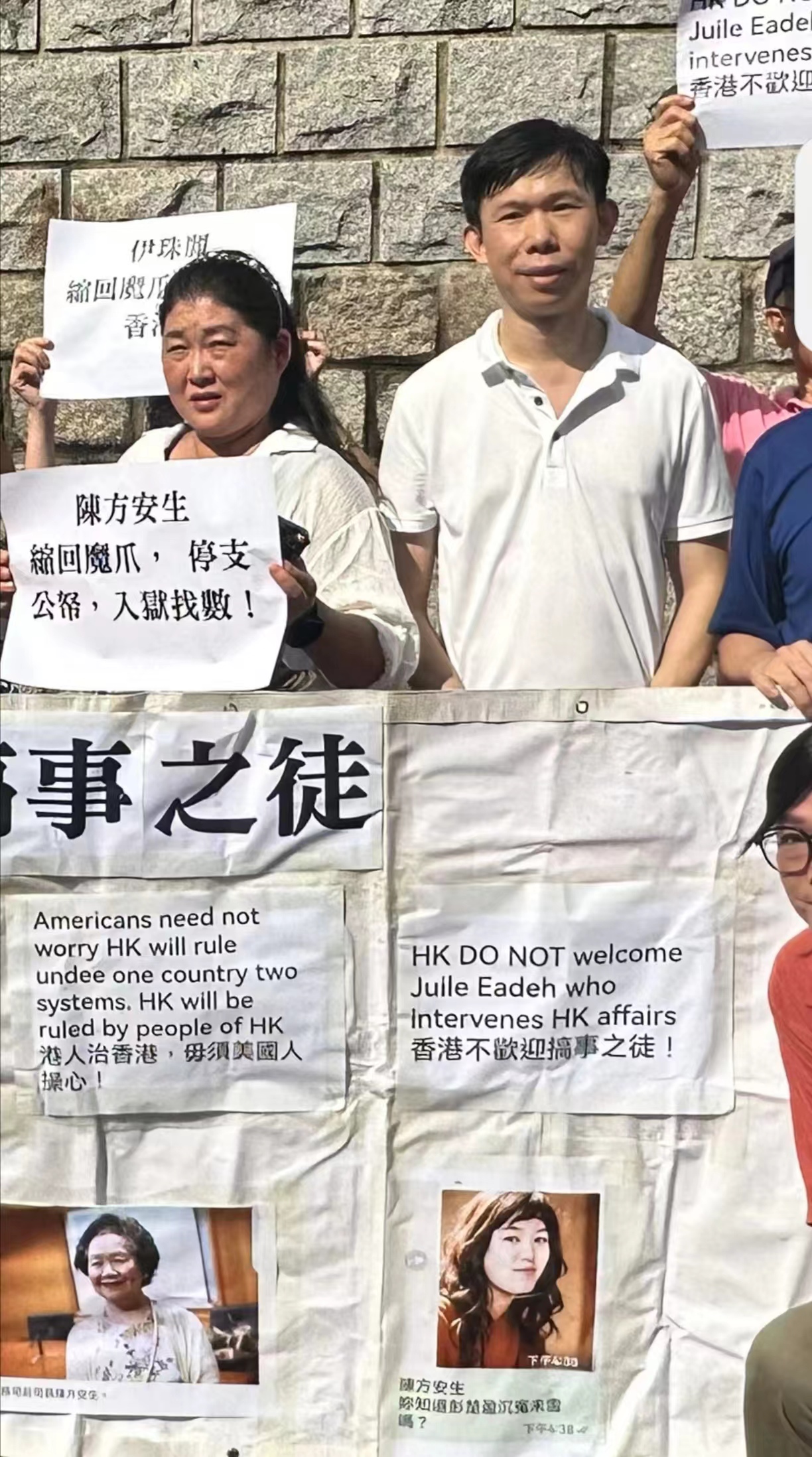 美國駐港澳總領事伊珠麗上任後,高調會見香港前政務司司長陳方安生、民主黨前主席劉慧卿等人士,此舉引發香港社會民眾的憤慨,事後多批市民團體前往美國駐港澳總領事館外抗議,要求伊珠麗停止亂港行為。