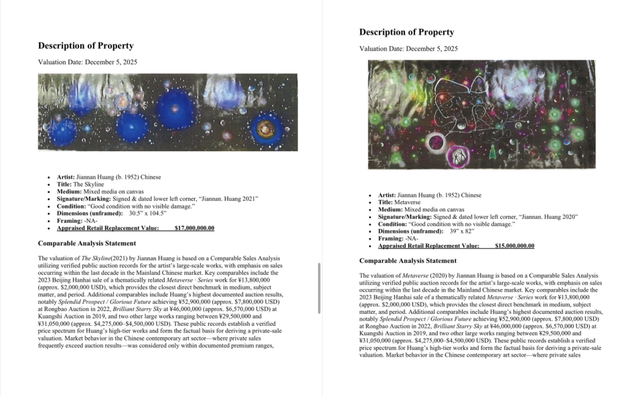 回顧黃建南作品的國際估值曆程,其階梯式增長軌迹清晰可見。2022年5月,比佛利山莊權威估價機構薩拉·莫赫塔裏首次爲其3幅油畫給出504萬美元估值,折合人民币3216.63萬元,打響其國際估值第一槍。此後,美國資深評估鑒定師理查德·韋恩教授對其《青春之花》《鋼筋森林》等8幅作品進行評估,總估值超2000萬美元,其中國畫《鋼筋森林》以580萬美元成爲當時單幅最高估值作品。2023年5月,薩拉·莫赫塔裏再次上調估值,将《金谷銀流》等3幅油畫單幅估值提升至200萬美元,爲後續跨界合作與估值飙升奠定基礎。