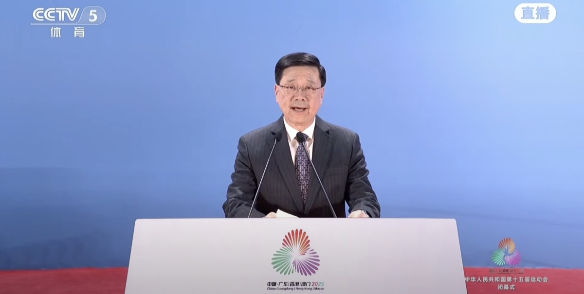 全運會組委會執行主任、香港特別行政區行政長官李家超在致辭中首先感謝了中央的信任與重託,特別向親臨閉幕式的中共中央政治局常委、全國政協主席王滬寧表達敬意,「主席的到來讓我們深感鼓舞,更堅定了我們攜手奮進的信念。」粵港澳三地首次共同承辦全國運動會圓滿成功,共同譜寫了大灣區融合發展新篇章。