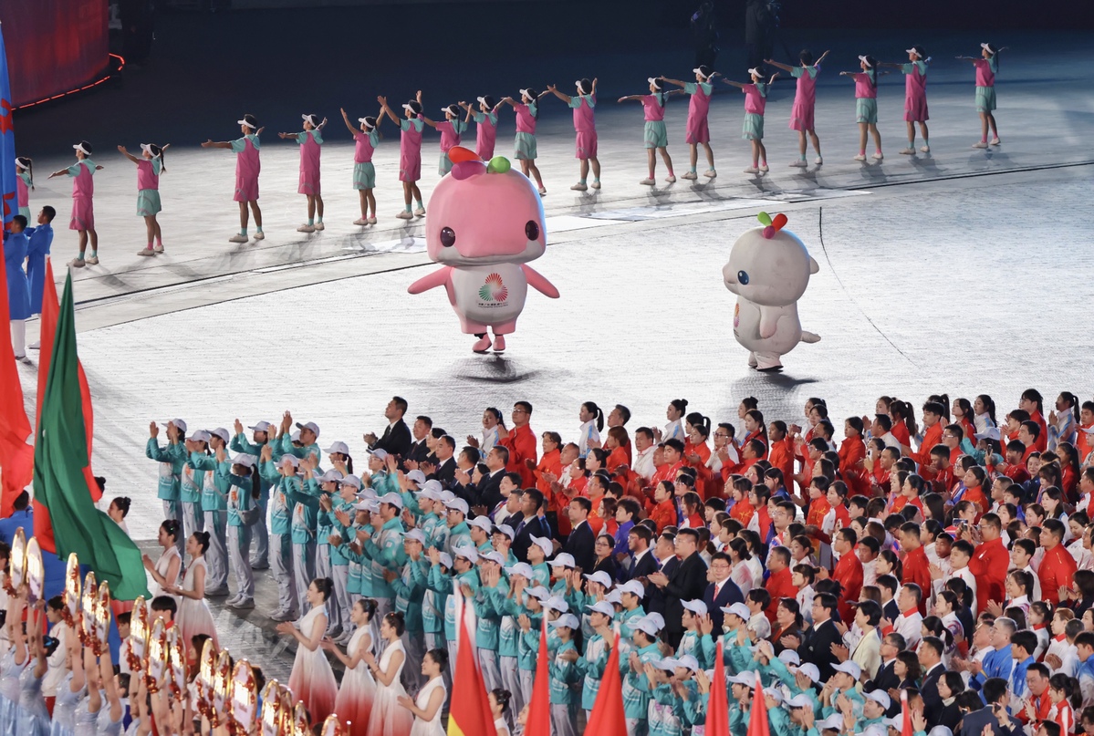 在運動員入場環節,各省份運動員自由「組隊」,和諧共融,廣東、香港、澳門代表團再次同場亮相,呼應了開幕式時的動人情景。