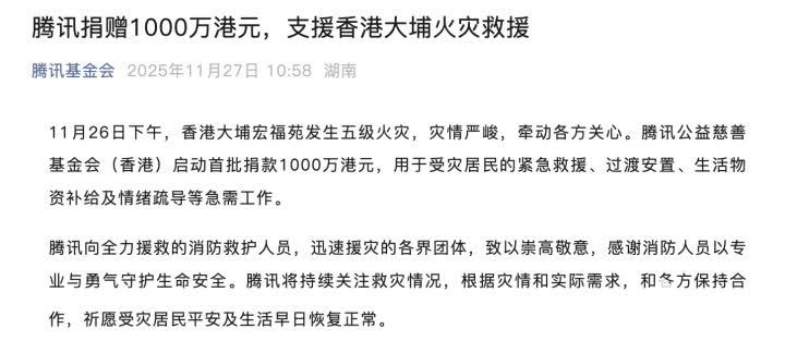 )今日(27日)宣布,啟動首批捐款1000萬港元,用於受災居民的緊急救援、過渡安置、生活物資補給及情緒疏導等急需工作。騰訊向全力援救的消防救護人員及迅速援災的各界團體致以崇高敬意,感謝消防人員以專業與勇氣守護生命安全。騰訊將持續關注救災情況,根據災情和實際需求,和各方保持合作,祈願受災居民平安及生活早日恢復正常。