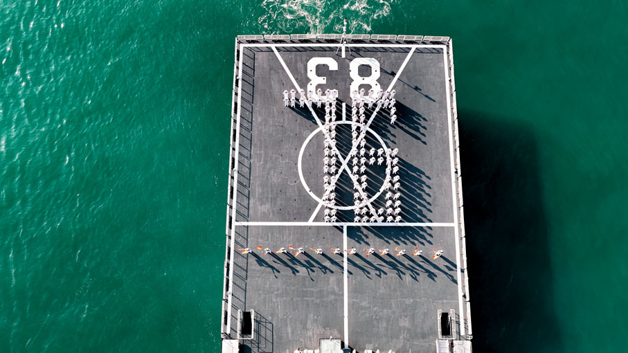 100餘名官兵擺出「76」字樣,並用旗語展示出「國安家好」的含義,為中華人民共和國成立76周年和香港市民送上祝福。不少香港市民自發在岸邊向艦上分區列隊的學員和官兵揮手致意。其後,戚繼光艦放下舷梯,編隊領導及官兵、學員代表在熱烈的軍樂聲中踏上昂船洲軍營碼頭,與駐港部隊官兵代表互致問候。
