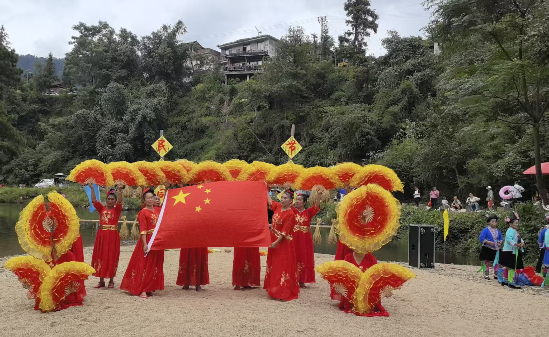 開場舞《中國范兒》率先炸響全場,苗家兒女的銀飾在陽光下閃爍,剛勁的舞步裡躍動著民族自信;移民文藝隊接唱《中國大舞臺》,高亢的嗓音唱出“山好水好人更親”的時代注腳。大屯隊的《情歌輕輕唱》如溪澗淌過心尖,唱的是山水間的浪漫,道的是鄰里間的溫情;整朵隊的《歡迎你歡迎你們的到來》則用最樸實的歌詞直抵人心:“山那邊的客人喲,苗家的米酒已溫熱,火塘邊的位置已留好……”