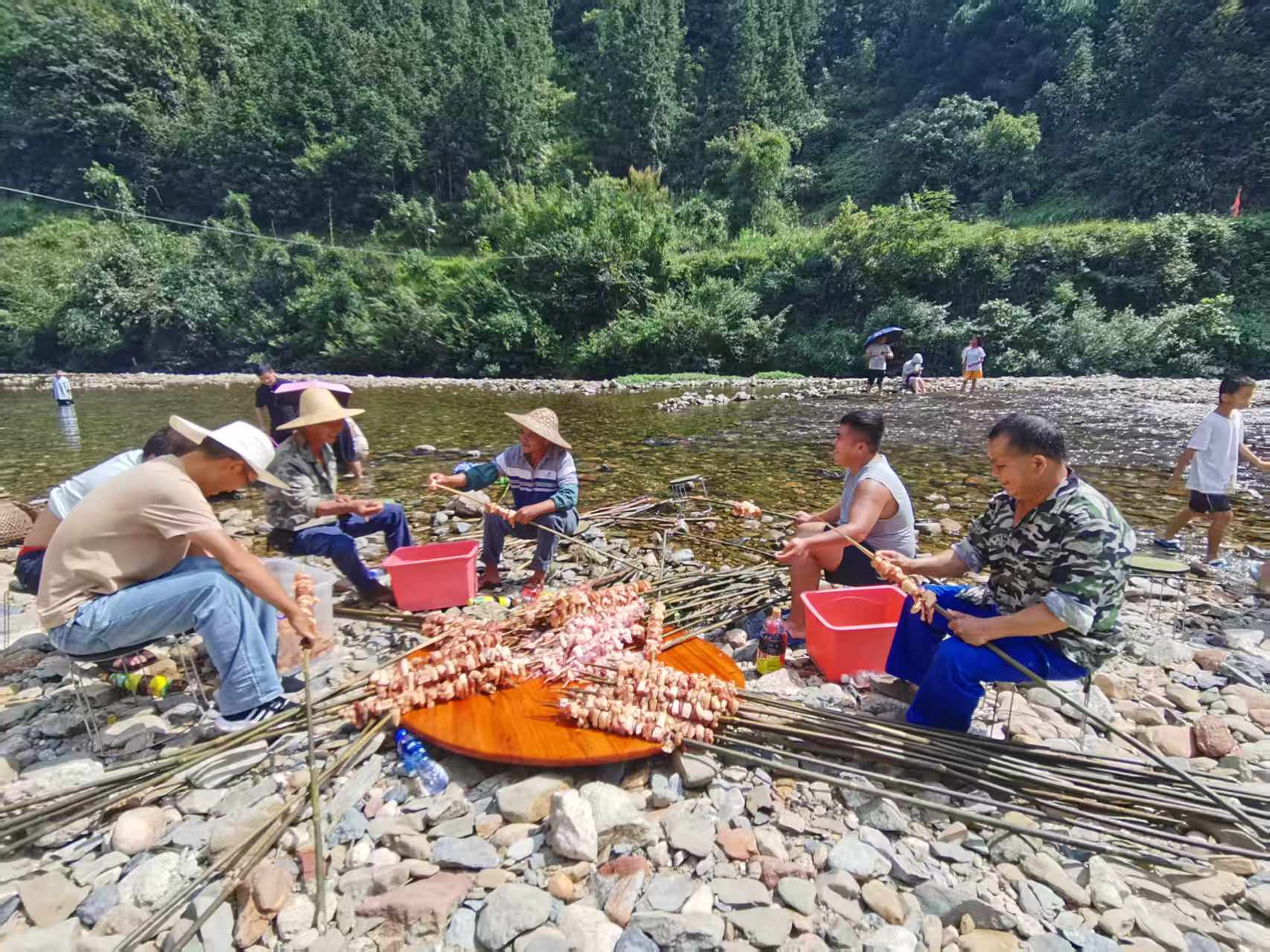 “元寶山的清泉養出河魚的鮮,整朵灘的細沙記得幾代人的笑。燒魚,是刻在苗家骨血裡的煙火密碼,更是代代相傳的文化根脈。”開幕式上,元寶村支書賈明文的聲音裹著風,掠過沙灘上攢動的人頭。他望著眼前忙碌的村民----有的在烤架前翻轉魚串,有的在戲臺旁調試音響,有的正給遠道而來的客人遞上酒水----感慨道:“燒魚節不只是吃頓熱鬧飯,是要讓老手藝活在當下,讓年輕人記住鄉愁,讓外面的人看見咱苗寨的新模樣。”