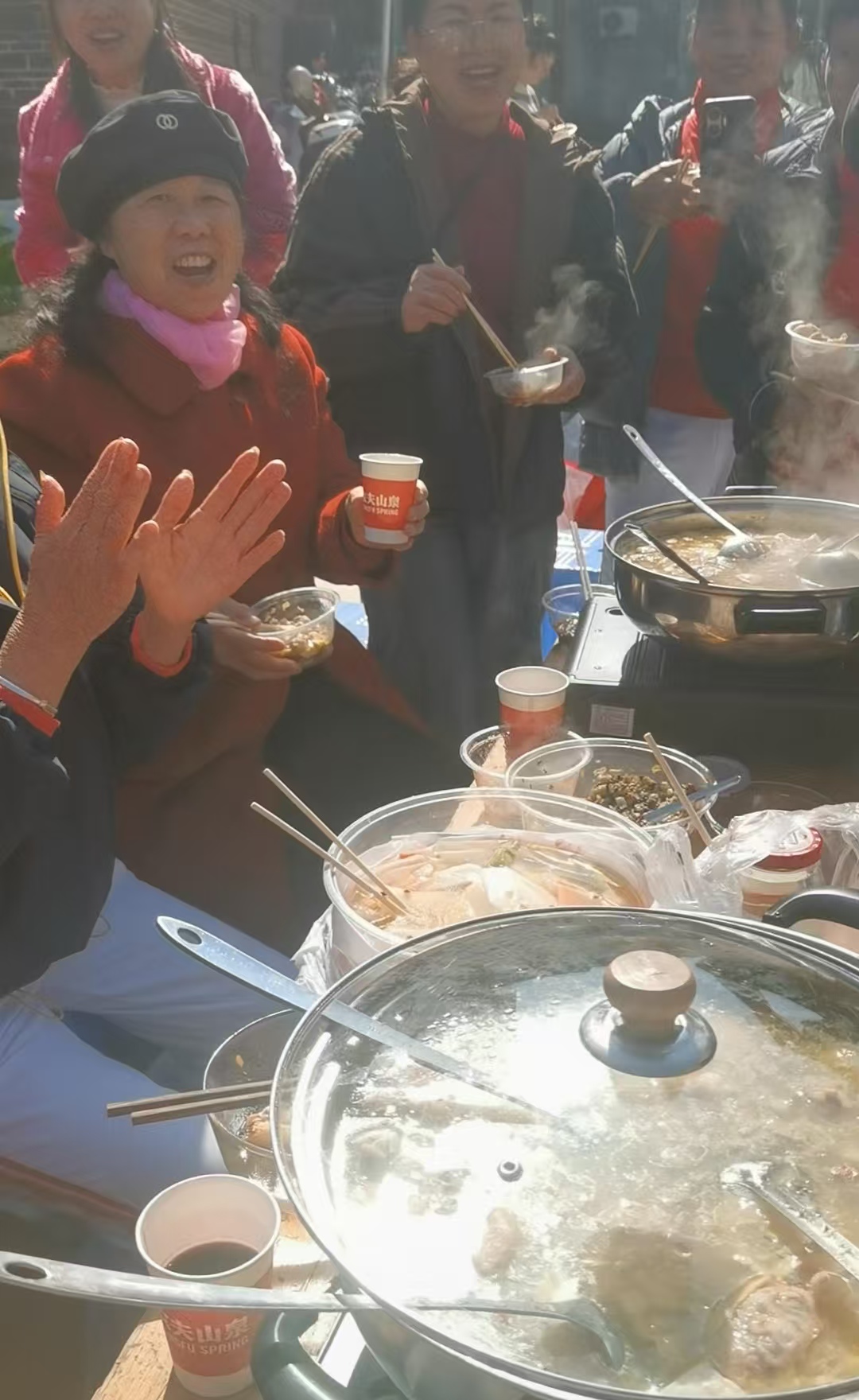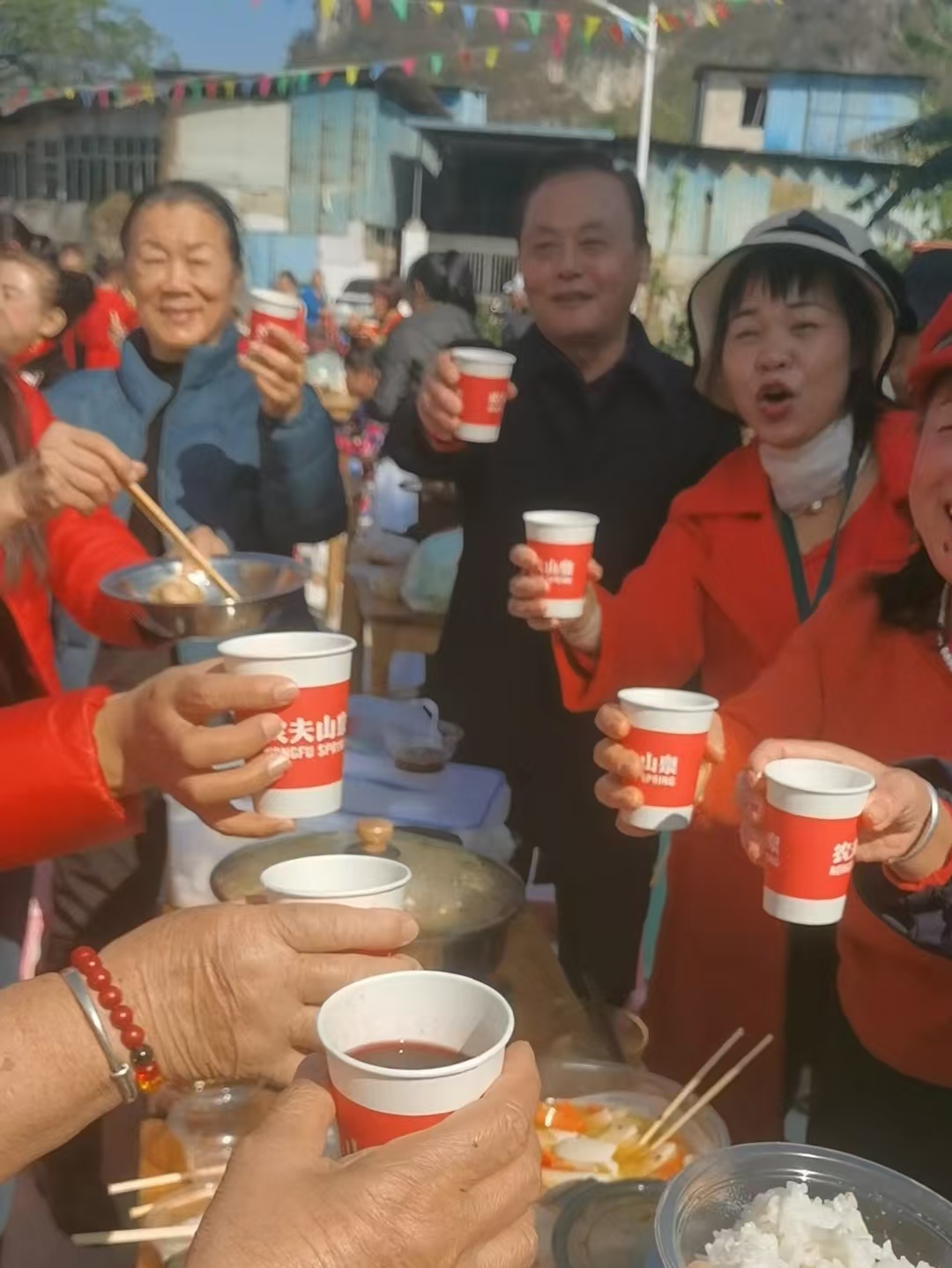 當進德手鼓隊的非洲鼓隨著馬蹄踏踏”的節奏落下最後一節,活動進入溫馨的長桌宴環節。各隊從村裏帶來拿手的“土貨”,土雞、豆腐、各種蔬菜與火鍋、邊爐、柴火灶齊上陣,大家圍爐而坐、舉杯相慶。